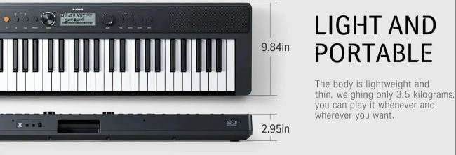 Kevyt ja ohut rakenne tekee SD-10:stä poikkeuksellisen helpon kuljettaa – soitin painaa vain 3,5 kg ja siinä on kätevä kantokahva. Tyylikäs, virtaviivainen muotoilu sekä klassinen mustavalkoinen koskettimisto sopivat yhtä hyvin moderniin kotiin kuin liikkuvan muusikon tarpeisiin.