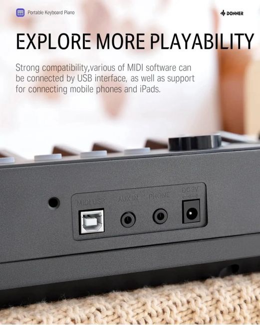 USB-liitännän ansiosta Donner SD-10 voidaan yhdistää erilaisiin MIDI-ohjelmistoihin, älypuhelimiin ja iPadeihin. Näin voit soittaa mukana taustanauhojen kanssa, käyttää oppimissovelluksia tai luoda musiikkia reaaliajassa digitaalisissa ympäristöissä.