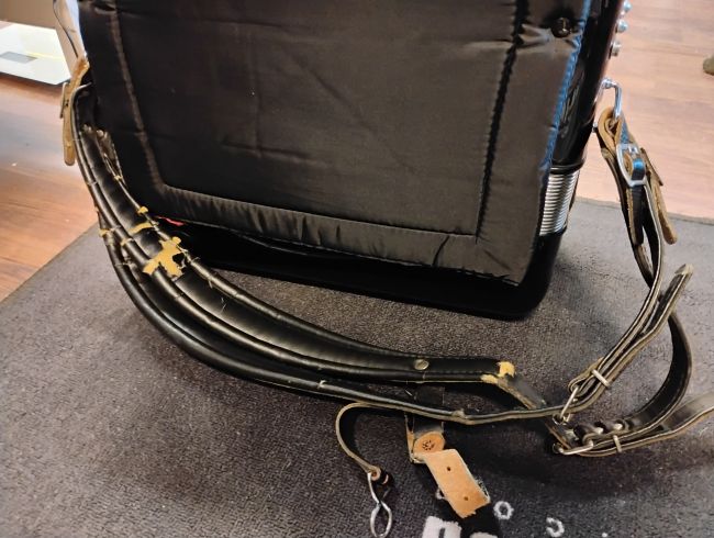 Hyväkuntoinen harmonikka, kulumaa hihnoissa.