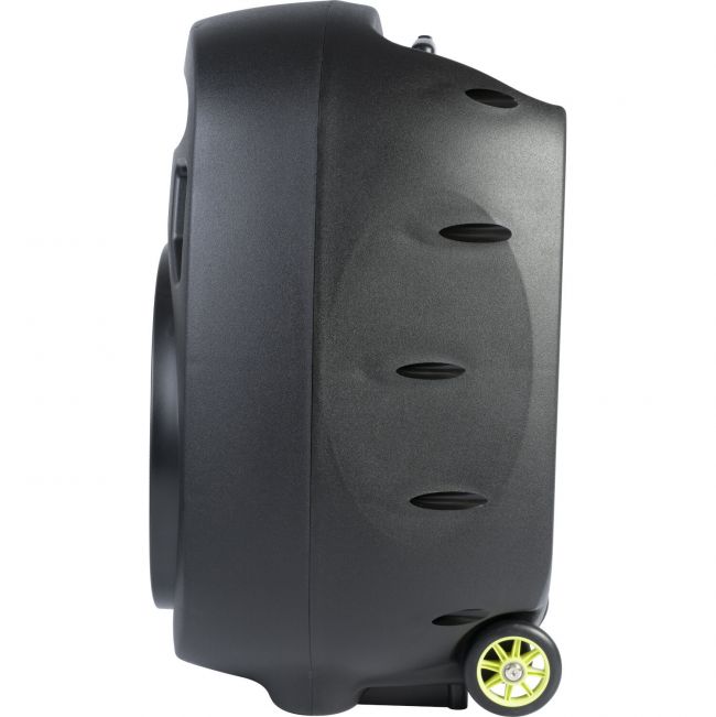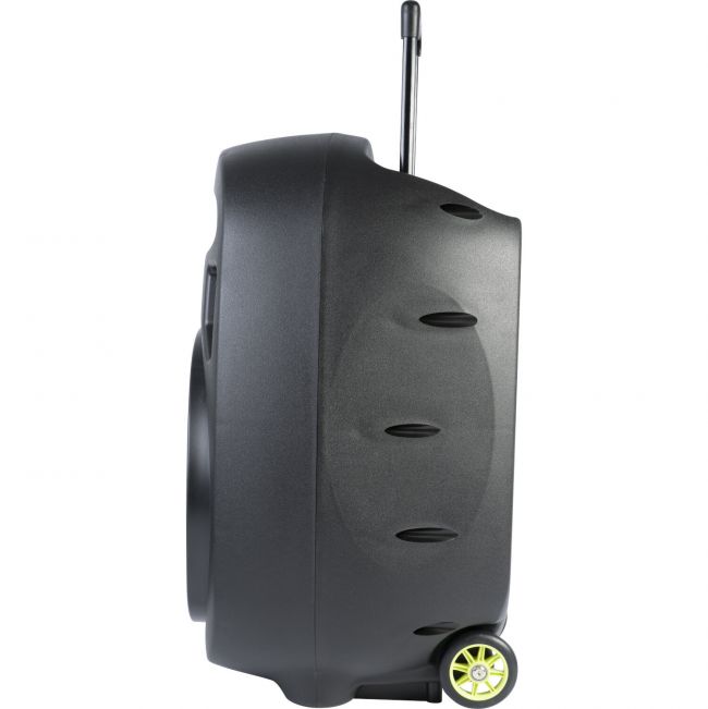 Tämä kaiutin ja mikrofoni -yhdistelmä ei vaadi jatkuvaa verkkovirtaa. Sisäänrakennettu 7200 mAh akku tarjoaa 4–6 tuntia käyttöaikaa yhdellä latauksella. Laitteen kuljettaminen on vaivatonta integroidun trolley-vetokahvan ja pehmeästi rullaavien pyörien ansiosta.