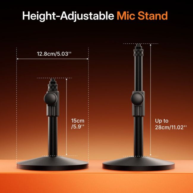 Mukana tuleva pöytäteline tekee Maono PD200W:stä valmiin ratkaisun työpöydälle – ideaalinen valinta, kun haluat yhdistää siistin setupin, joustavan liitettävyyden ja ammattitasoisen äänenlaadun yhdessä mikrofonissa.
