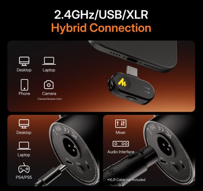 Maono PD200W tarjoaa langattoman yhteyden, USB-liitännän ja perinteisen XLR-lähdön samassa mikrofonissa. Voit käyttää sitä suoraan tietokoneen USB-portissa, liittää XLR-kaapelilla äänikorttiin tai hyödyntää langatonta yhteyttä tilanteissa, joissa haluat liikkua vapaammin. Tämä tekee PD200W:stä joustavan ratkaisun sekä aloittelevalle että kokeneelle sisällöntuottajalle.