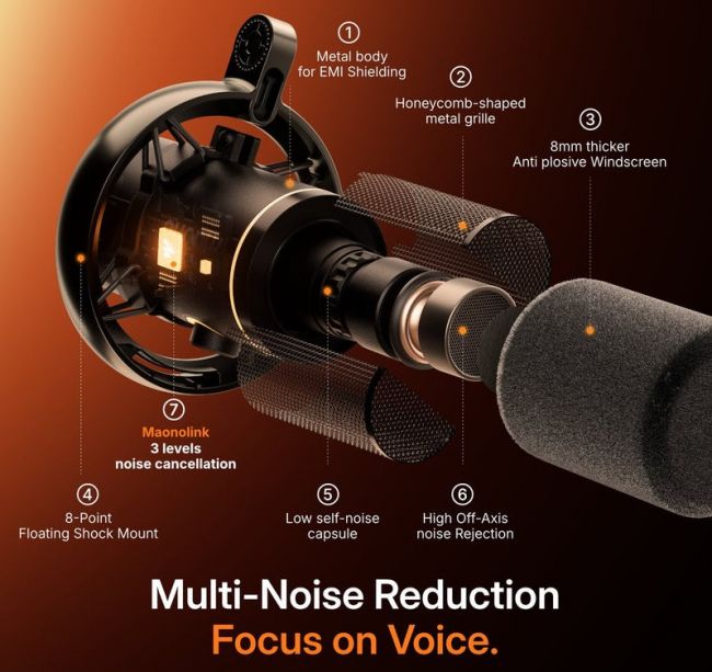 Mikrofonin dynaaminen kapseli ja taustakohinan vaimennus tuottavat lähetystasoisen, selkeän puheäänen, joka sopii erinomaisesti Twitch-striimeihin, podcasteihin, YouTube-videoihin ja etäpalavereihin. Kardioidi-suuntakuvio poimii äänen pääasiassa mikrofonin edestä ja vähentää taustahälyä sivuilta ja takaa, jolloin kuulijat keskittyvät ääneesi – eivät huoneen muihin ääniin.Muokkaa soundiasi MaonoLink-sovelluksella